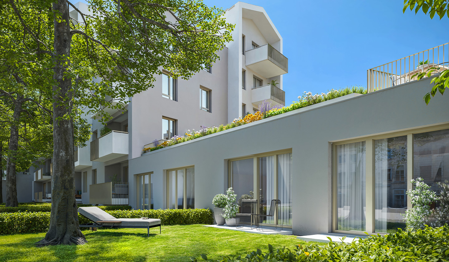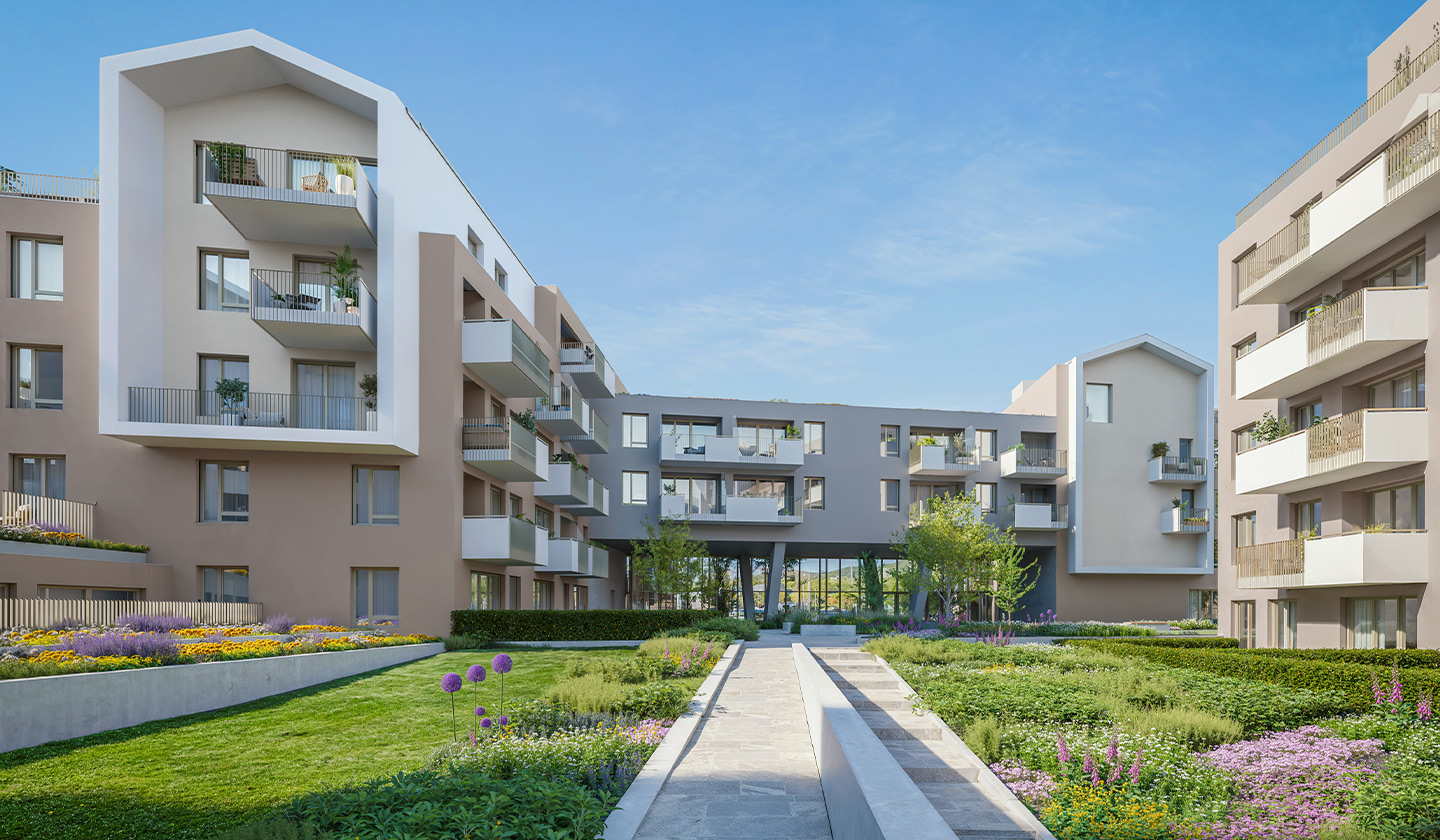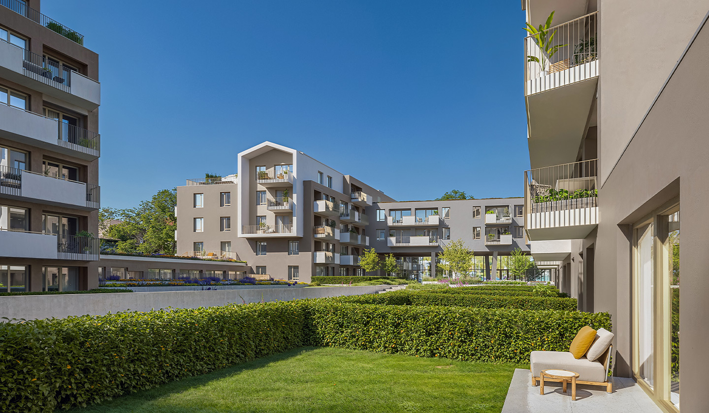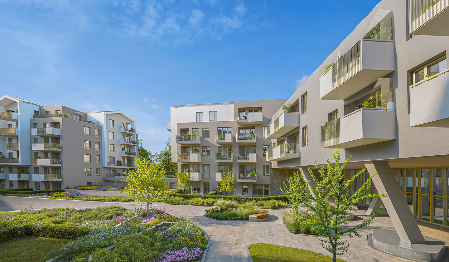 Among the 297 modern apartments, you will find the ideal size and layout for you, from practical studios to spacious family homes with a living room and 3 bedrooms. The internal community garden creates a green island in the heart of the residential park. The clean lines of Scandinavian modernity inspired the appearance of the building complex.